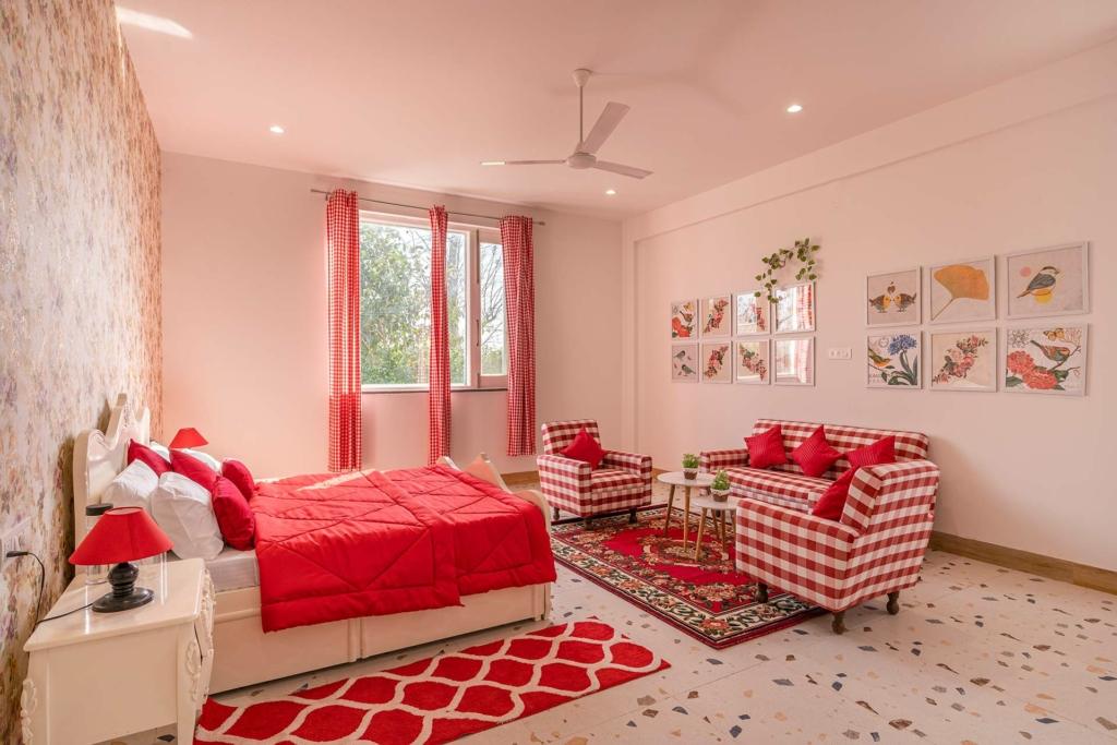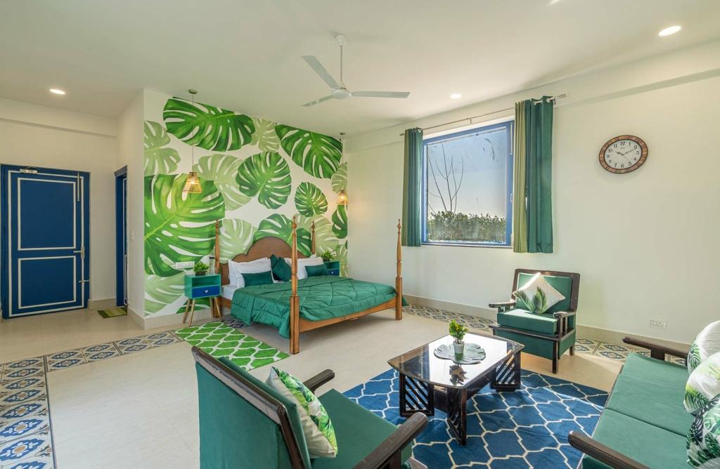 Walk down the hallway, and you’ll find two generously spaced bedrooms, making this the perfect 2 BHK villa in Delhi for small families, couples, or friends. Every room carries the villa’s signature aesthetic — clean, airy, uncluttered — with soft bedding, warm lighting, and wide windows that overlook, once again, the sweeping agricultural fields that cradle the property.