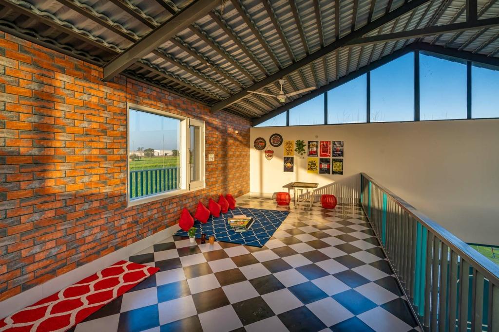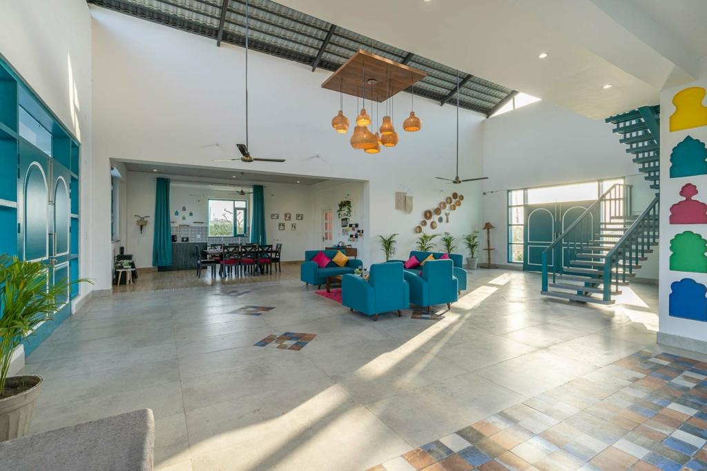 The open layout pulls the outdoors inward. Large windows frame the agricultural fields like a living artwork, reminding you that you’re still deep within nature despite being in an affordable villa in Delhi NCR.