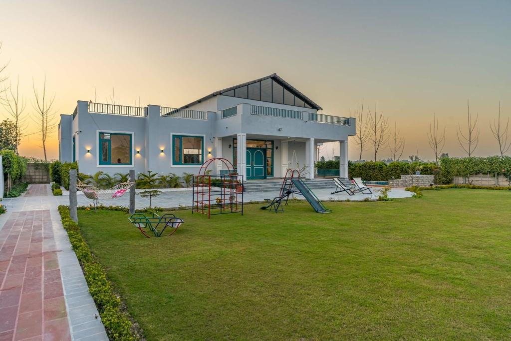 There’s something disarming about arriving at Colour Bloom for the first time. The moment your car turns off the main road and begins gliding down a quiet countryside lane, you feel Delhi loosening its grip. The villa sits in the middle of sprawling agricultural fields, a lone white structure wrapped in gentle greens that move like slow waves in the breeze. At sunset, the fields glow gold around it, as if the villa itself is glowing from within.