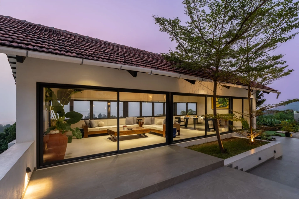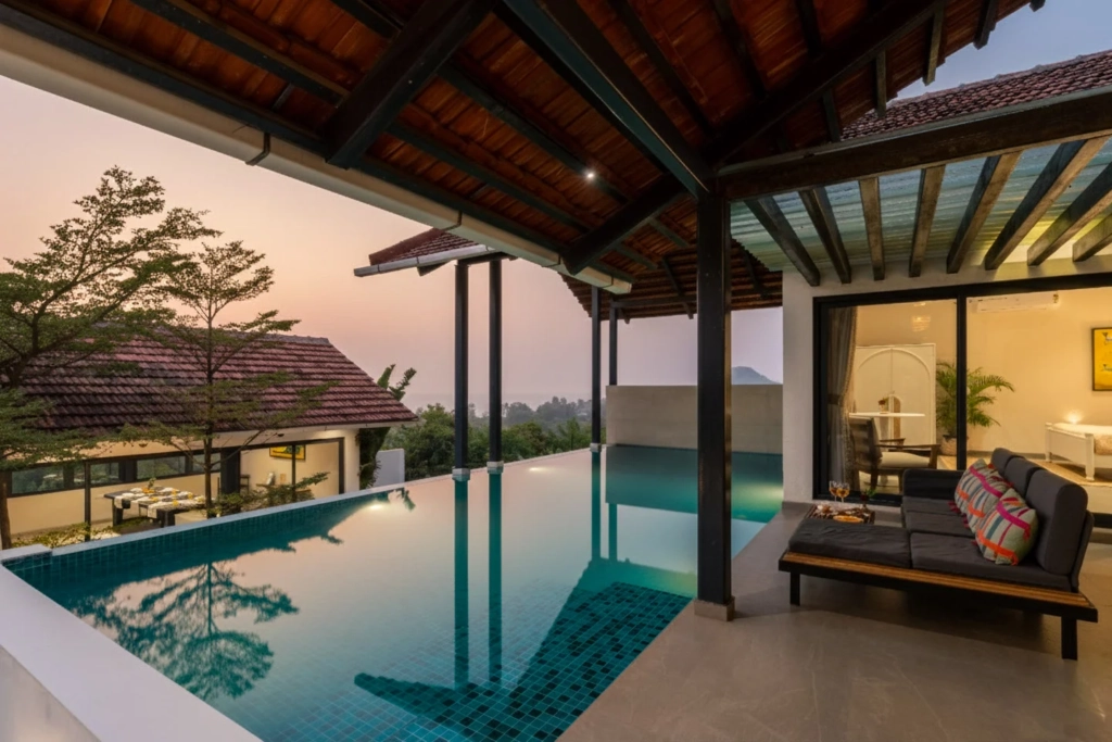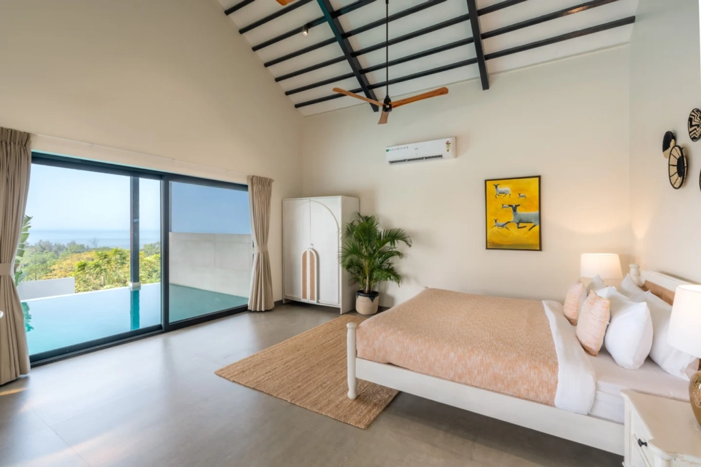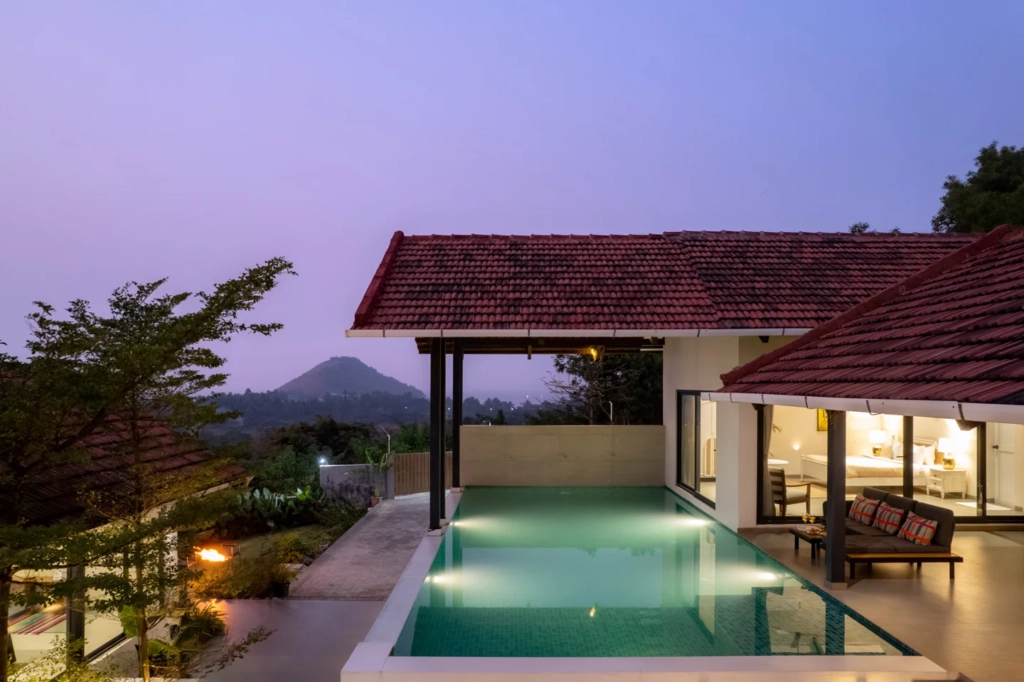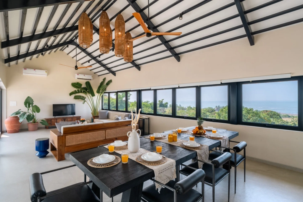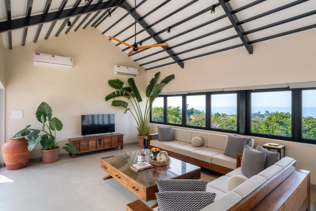 What sets Ekan By The Sea apart is its location. The villa in Alibaug sits on an elevated patch of land near Korlai Beach, allowing sweeping views of both the surrounding hills and the Arabian Sea.
