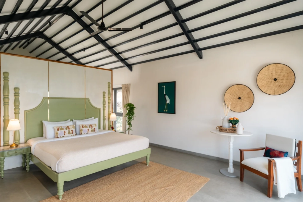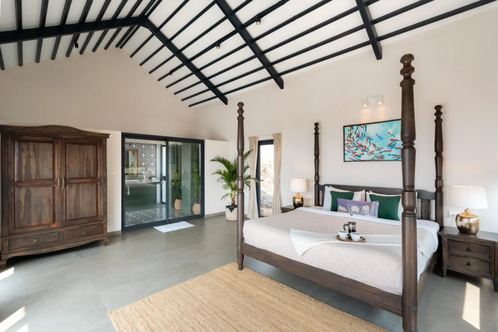 The villa in Alibaug features four bedrooms with attached bathrooms, designed to give each guest their own sense of privacy while still being part of the group experience.