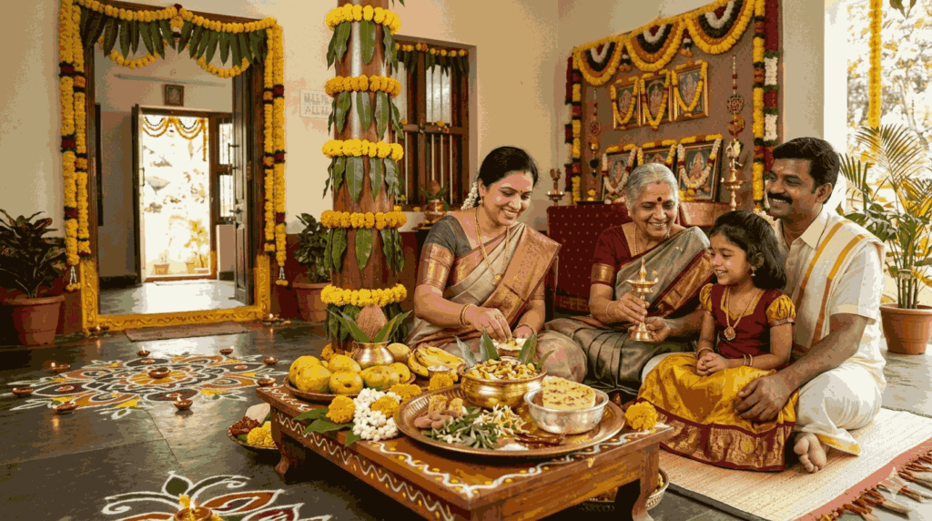 - Decorating homes with mango leaves and rangoli