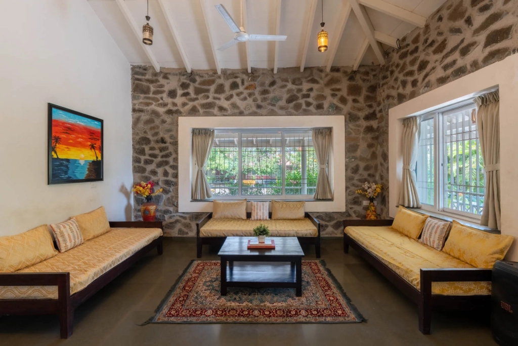 Large windows invite natural light through the day, while quiet surroundings make the nights deeply restful. The property’s layout comfortably hosts groups looking for a private retreat close to Shirdi.