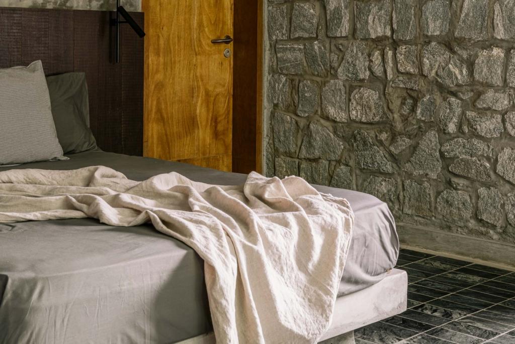 Set within a serene, secluded setting near Hosur, this villa near Bangalore takes its cues from nature. Earthy interiors anchored by natural textures blend with thoughtfully curated décor, making every corner feel intentional yet comfortably lived-in. Tall windows bring the outside in, while open living spaces encourage connection — whether it’s shared laughter over coffee or quiet solo moments with a book.
