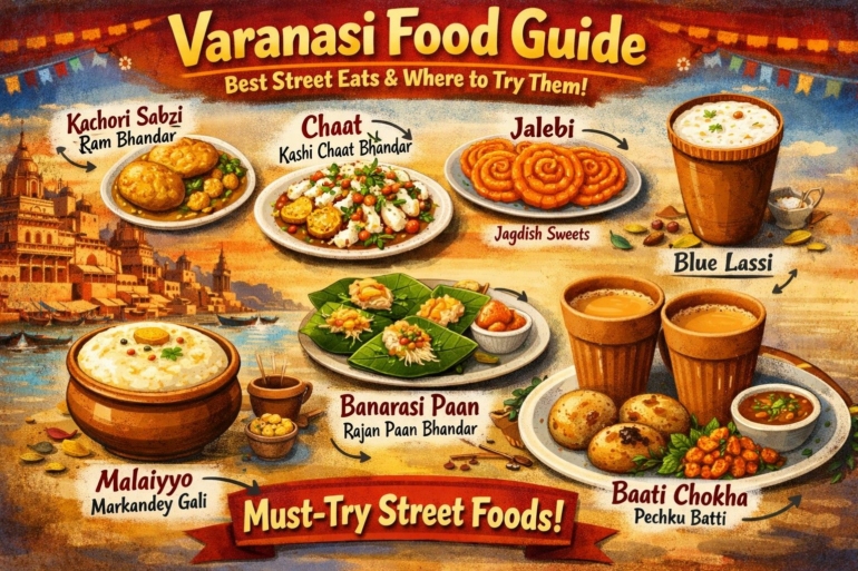 Varanasi Food Guide is your complete roadmap to discovering the best street eats in Banaras city, including where to try iconic dishes like kachori sabzi, tamatar chaat, malaiyyo, and the…