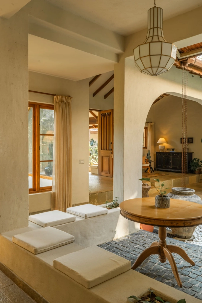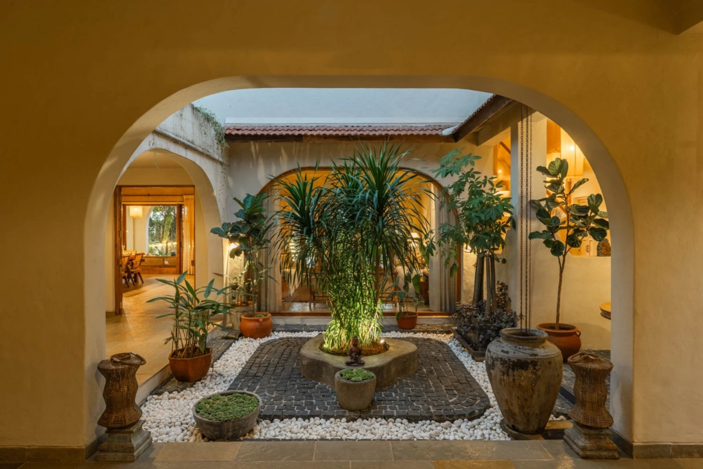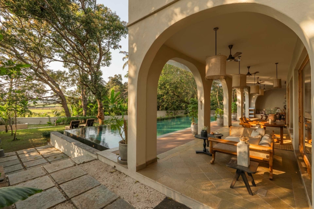 One of the most striking elements, however, is the central courtyard-style space, where indoor meets outdoor in the most seamless way. Framed by soft arches and filled with greenery, it adds a sense of depth and calm that is rare to find in most luxury villas in Goa with private pool.